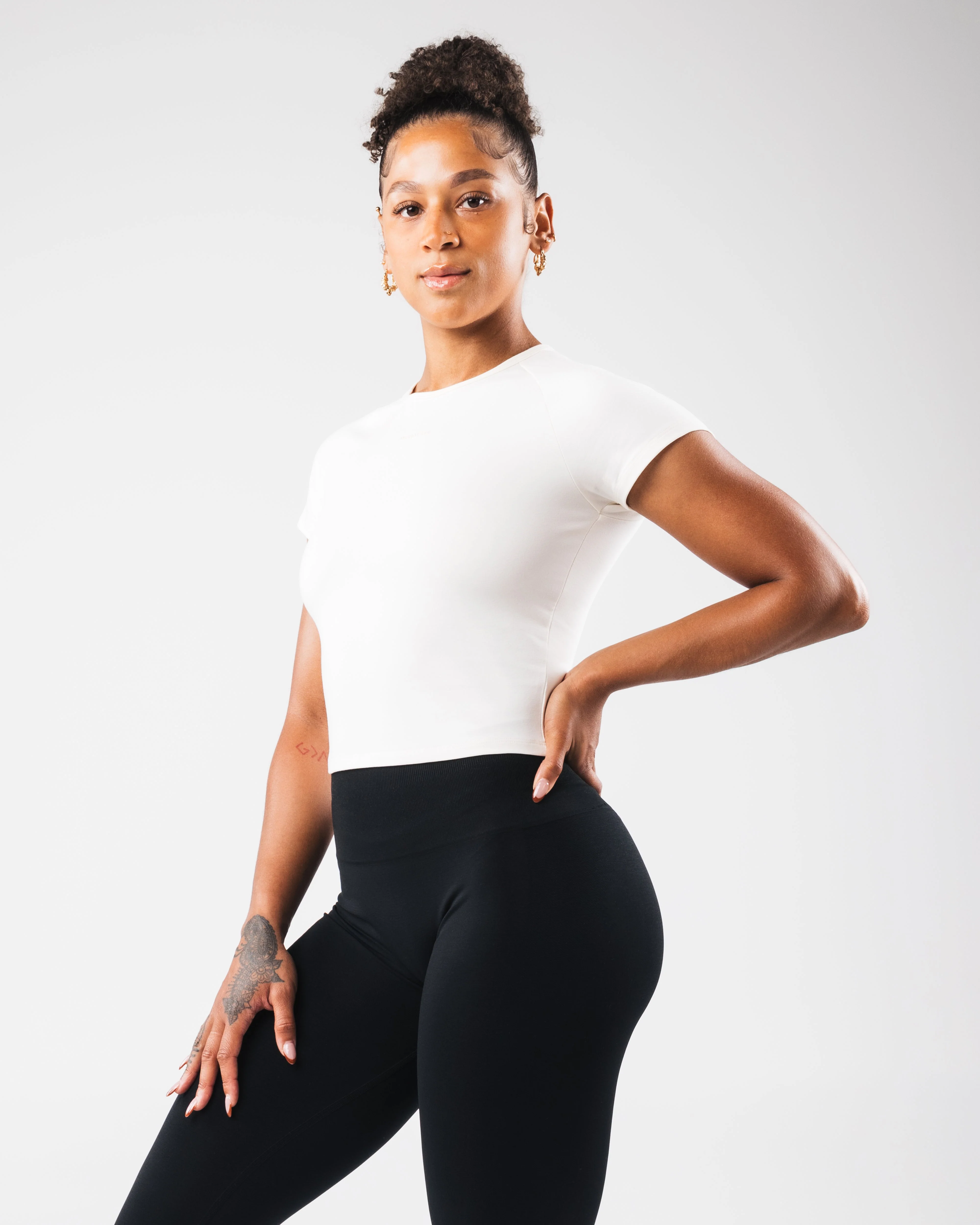 Our baby tee features raglan short sleeves and hits right below natural waist, enhancing natural curves. Cool to the touch, breathable and with an ultra smooth feel, our signature fabric has been reimagined to offer a new look for women. Our tee also provides sweat-wicking properties allowing for quick drying, while the cooling effect allows for body heat to be repelled away instantly. Branding features our Alphalete Core logo in rubberized aplique on chest.